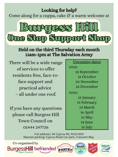 This is delivered with our partners: Burgess Hill Town Council, Burgess Hill Pantry, Befriended , Burgess Hill Youth and The Salvation Army. There will be other organisations present, details of who will be there will be available closer to the date.